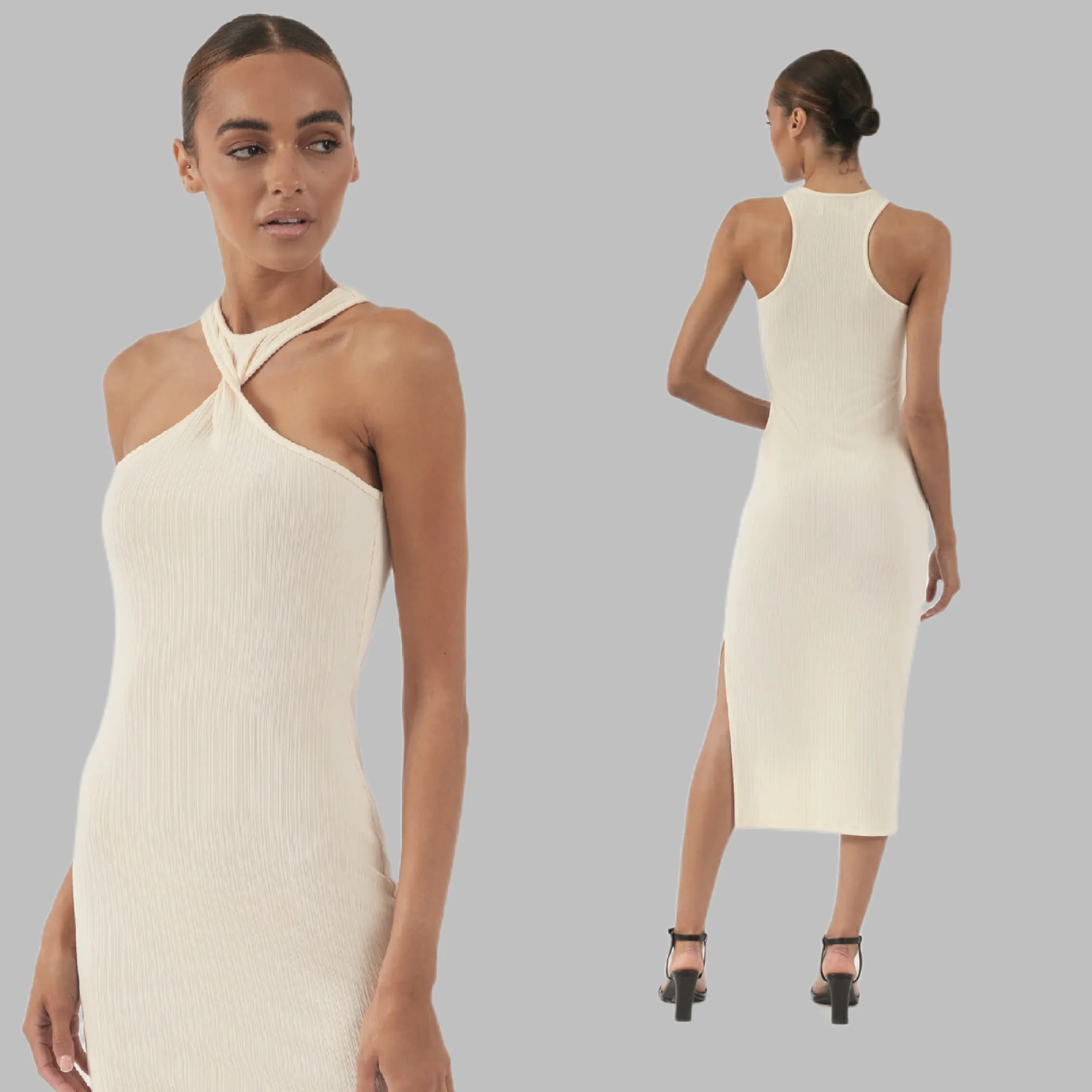 Designed with a subtle leg split for movement and ease, this midi-length dress balances understated elegance with a confident edge. An effortless option for evenings, occasions, or when you want something elevated without feeling overdone.