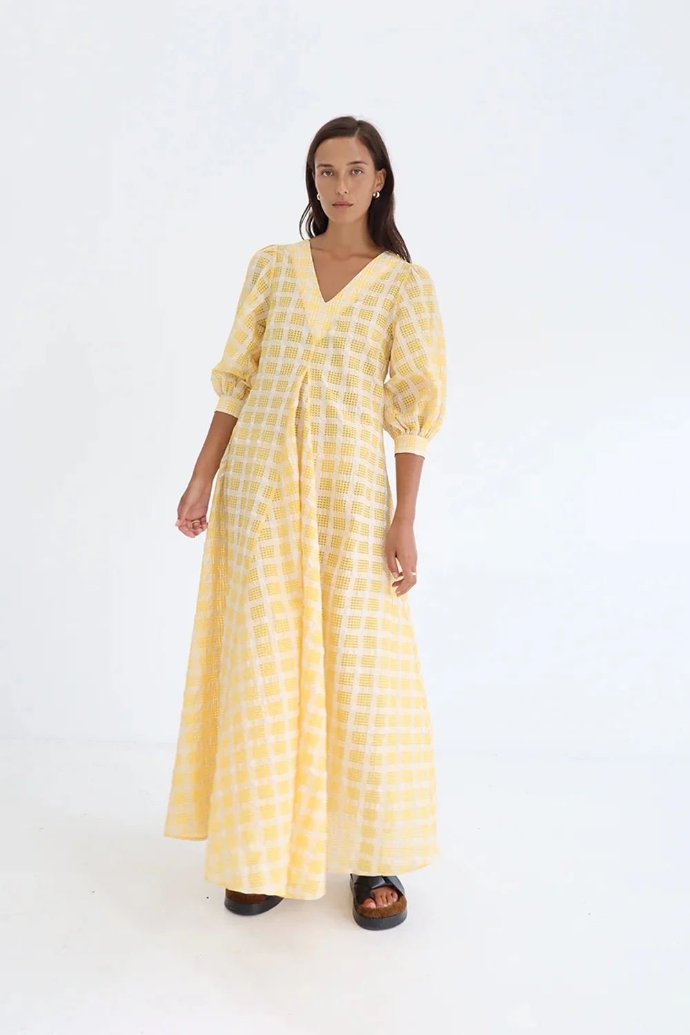 The Fennie Dress featuring a textural seersucker style fabric, v-neck (front and back), exaggerated sleeves and an a-line fit is an easy to wear style that can transition from everyday to festive dressing.