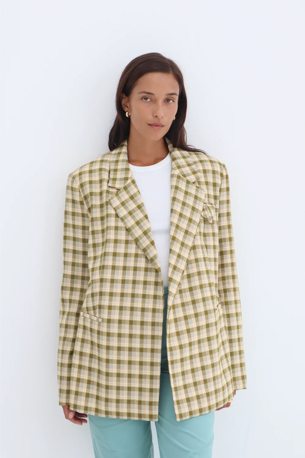 The Samantha Blazer offered in a vintage green/yellow check has an oversized fit, boxy fit, and pocket detailing.