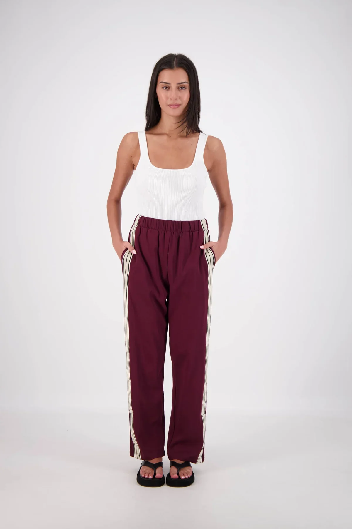 Striking a balance between laidback and polished, the Panarea Trackpant by Jasmine Alexa in rich plum offers everyday comfort with a refined twist. Made from soft 100% cotton, it features a relaxed high-waisted fit, adjustable drawstring waistband, and a clean white side stripe that adds structure without fuss.