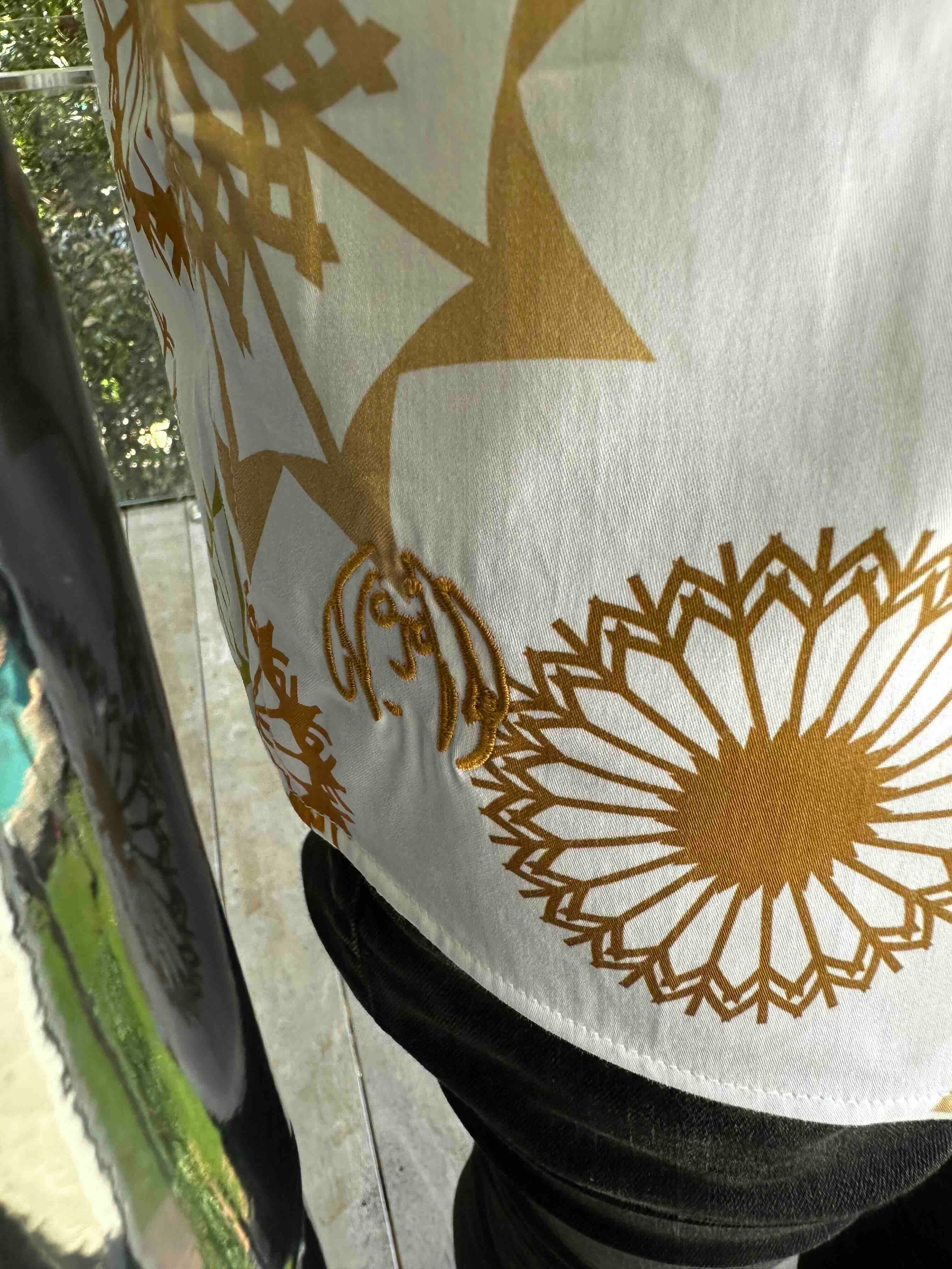 Golden-brown John Lennon signature embroidery at right hip