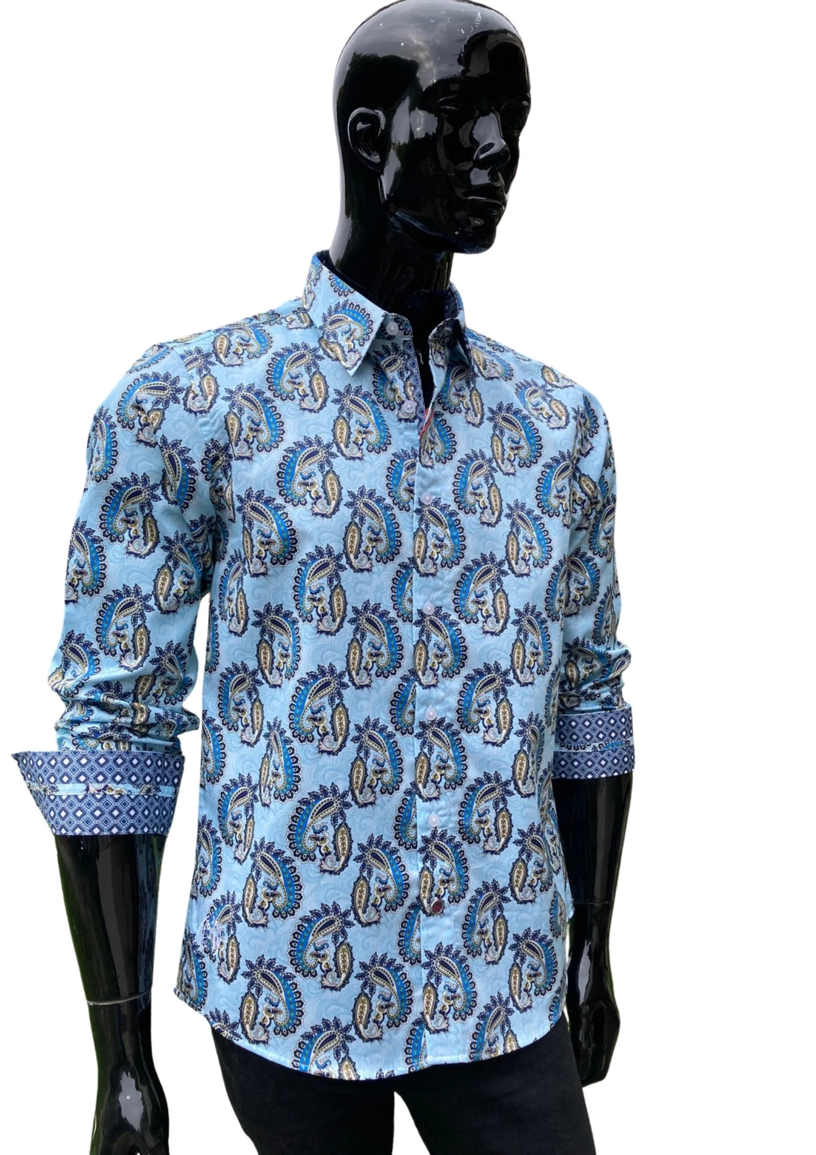 * Tonally blended Blue printed placket and cuffs