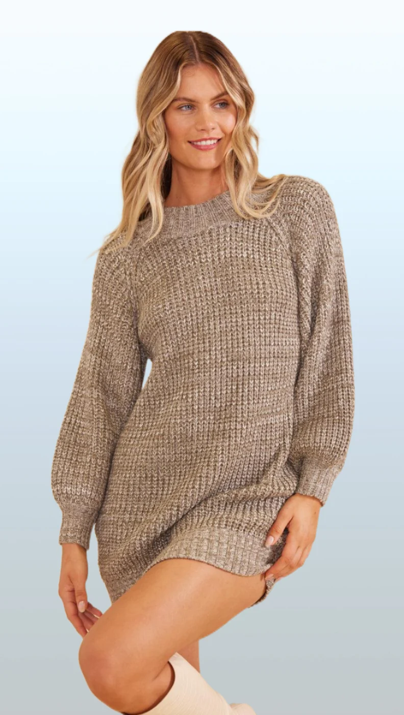 The Aspen Knit Mini Dress is a cozy and chic option for cooler weather. Crafted from a khaki marle knit yarn, it features voluminous sleeves and a relaxed silhouette with a mock neckline.
