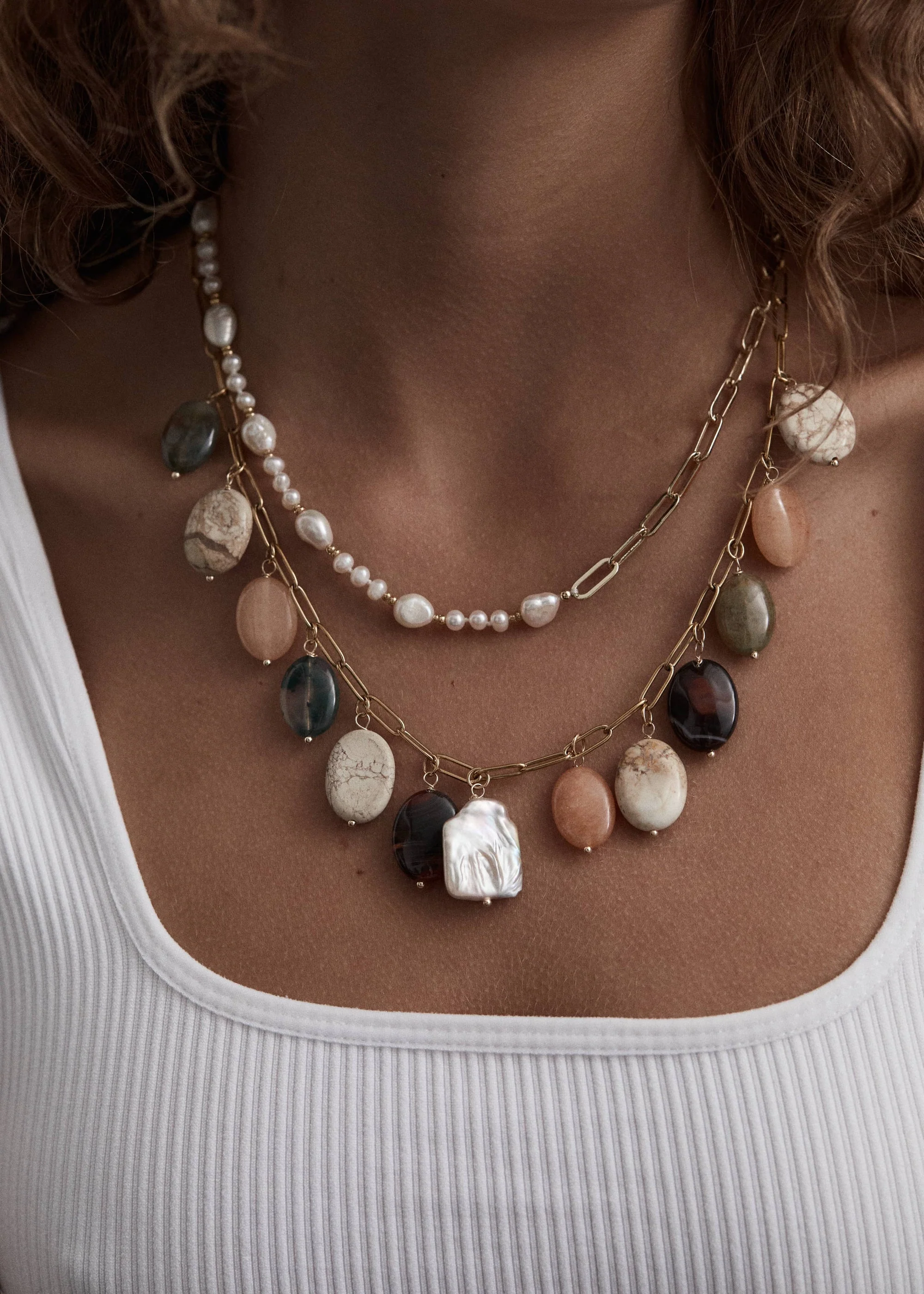Crafted with an 18KT gold-fill chain, the design features softly shaped natural gemstones spaced along the neckline. The mix of earthy tones gives the necklace a natural charm that pairs comfortably with a wide range of wardrobe colours.