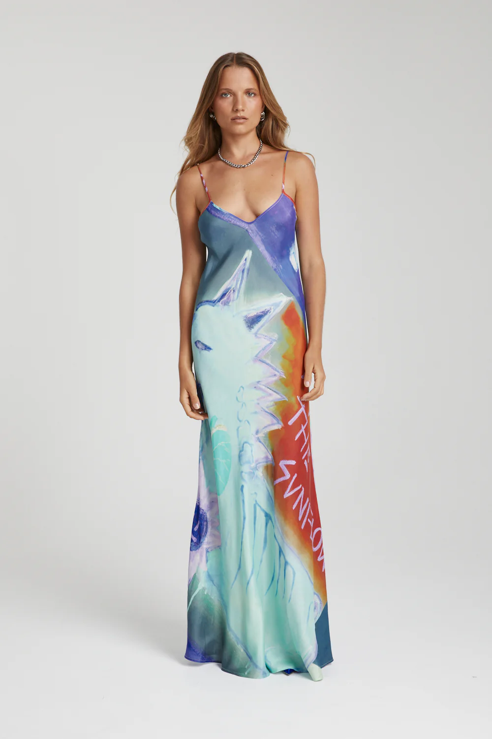 Our infamous Siren Dress cut from our latest W24 statement print, DON'T EAT THE SUNFLWRS! Made from a lux cupro/ viscose blend creating a relaxed yet form-flattering fit.